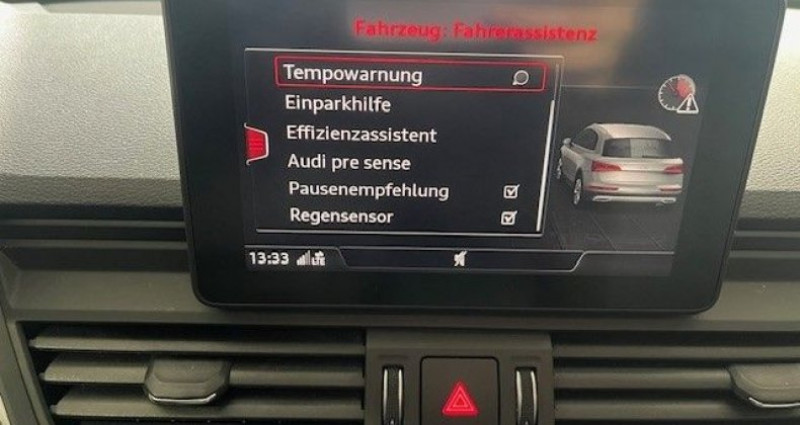 Équipement - abs - quatre roues motrices - accoudoir - bluetooth - ordinateur de bord - rails de toit - hayon électrique - rétroviseurs latéraux électriques - réglage électrique des sièges - antidémarrage électrique - esp - dispositif mains libres - garantie - séparation du compartiment à bagages - limiteur de vitesse - isofix - volant en cuir - phares à led - jantes en alliage léger - capteur de lumière - soutien lombaire - volant multifonctions - système de navigation - assistance au freinage d'urgence - kit de dépannage - filtre à particules - radio dab - capteur de pluie - contrôle de la pression des pneus - carnet de chèques bien tenu - direction assistée - sièges chauffants - châssis sport - sièges sport - système automatique start/stop - contrôle de la traction - verrouillage central description du véhicule selon le fournisseur boîte de vitesses - boîte de vitesses automatique - 8 vitesses Éclairage et visibilité - phares à led - capteur de lumière - fonction coming home - fonction leaving-home - réglage de la portée des phares technique et sécurité - rabattement en deux parties - châssis sport s avec régulation de l'amortissement - airbags latéraux à l'avant et système d'airbags de tête - sièges chauffants à l'avant - pare-soleil côté conducteur et côté passager - côté passager avant plaque signalétique spéciale ue - sièges sport à l'avant - zones de climatisation standard - système start-stoppare-chocs renforcé - tiptronictiptronic - protection transport (version 2)filet de séparationfréquence porteuse 433 - airbags latéraux - abs - esp - contrôle de la traction - verrouillage central - direction assistée - système automatique de démarrage et d'arrêt - antidémarrage électronique - ordinateur de bord - inform. conducteur display (fid) - airbag conducteur - gicleurs de lave-glace chauffants systèmes d'assistance - limiteur de vitesse - assistance au freinage d'urgence multimédia - réglable axialement et verticalement - réglage de la portée des phares - mild-hybridavec - caméra multifonctions - avec plaques/autocollants/certificats de sécurité spéciaux pour l'allemagne - navigation mmi - module de navigation mmi®. - désignation du modèle selon le nouveau code de performance - version non-fumeur - quattro avec différentiel central autobloquant - radio high scale (gen2) - indicateur de contrôle de la pression des pneus - kit de réparation des pneus - alternateur de démarrage à courroie rsg 48v 110-250 a - dossier de siège arrière - radio (dab / numérique) - interface mp3 - kit mains libres - bluetooth confort - manuel - fixation de siège enfant isofix et top tether pour les sièges extérieurs - sièges arrière extérieurs - verre transparent - climatisation automatique - tapis de sol du coffre - appuie-tête à l'avant - réservoir de carburant avec volume de remplissage accru - système de carburant diesel - réfrigérant r1234yf - plancher de chargementchargeur - protection des bords en acier inoxydable - feux arrière à led avec clignotants dynamiques - phares à led - volant en cuir à 3 branches avec multifonction plus - aide au stationnement arrière - détecteur de pluie - rétroviseurs extérieurs électriques - anglais-allemandequipement monderétroviseur extérieur à réglage et dégivrage électriquesrétroviseur extérieur gauche - hayon él. / automatique equipement intérieur - sièges électriques - soutien lombaire à 4 voies pour les sièges avantréseau de bord 48 voltsmoteur diesel 6 cyl. 3 - accoudoir central - séparation du compartiment à bagages - sièges arrière rabattables equipement extérieur - eu6 dganoyau de sérieréservoir adblue avec volume de remplissage accruairbags conducteur et passager avec désactivation de l'airbag passagercombinaison fréquence/cuir alcantara avec gaufrage sjantes en aluminium coulé à 5 branches doubles en forme d'étoile barres de toit autres - filtre à particules - carnet de chèques bien entretenu plus d'informations - tdi common rail moteur de base est : tu8/t2s8 - haut-parleur - concept de gaz d'échappement - gris contraste partiellement poli taille 8 j x 20 - audi connect navigation & infotainment - audi connect navigation & infotainment (3 mois) - audi connect appel d'urgence & service avec audi connect remote & control - audi drive selectaudi pre sense city